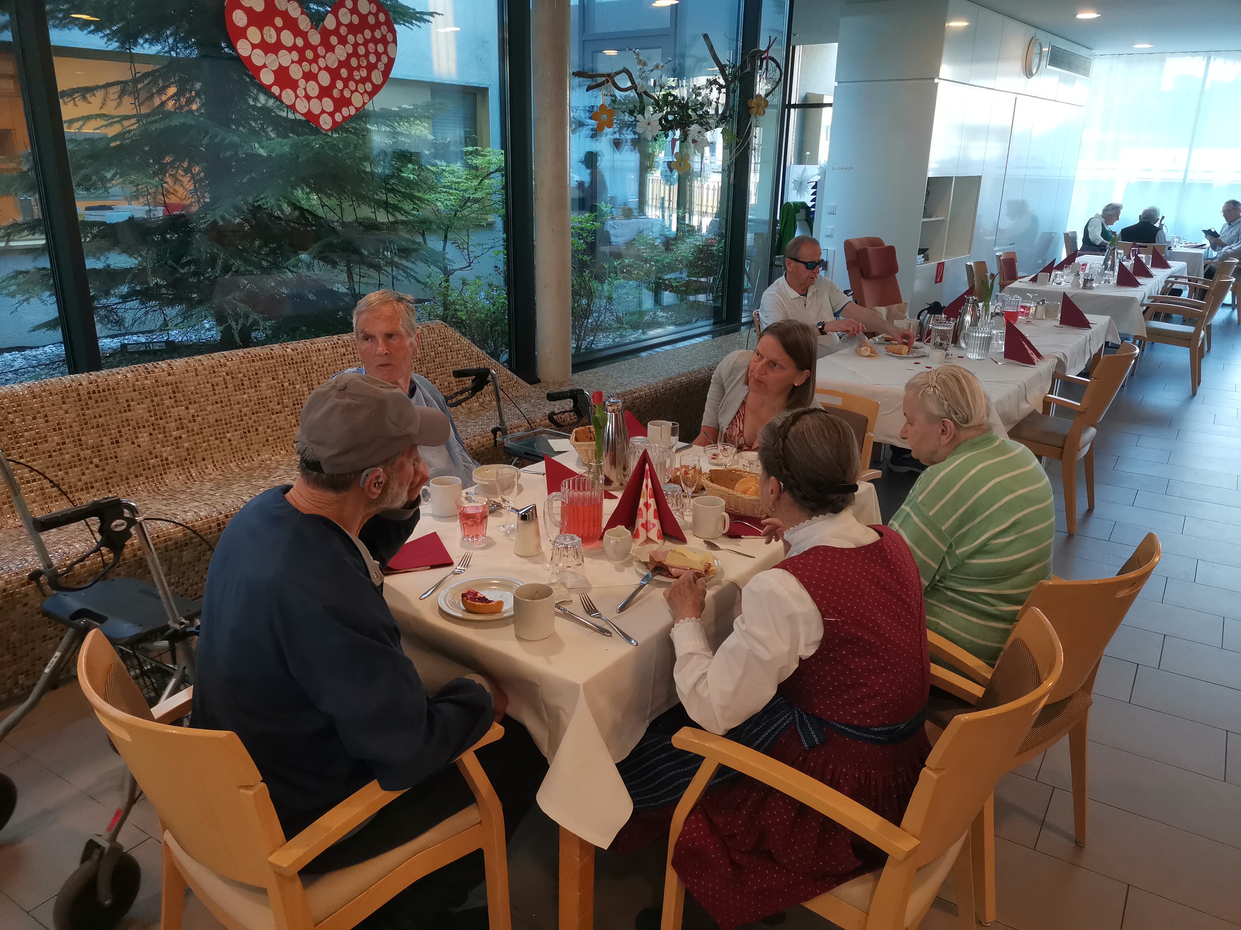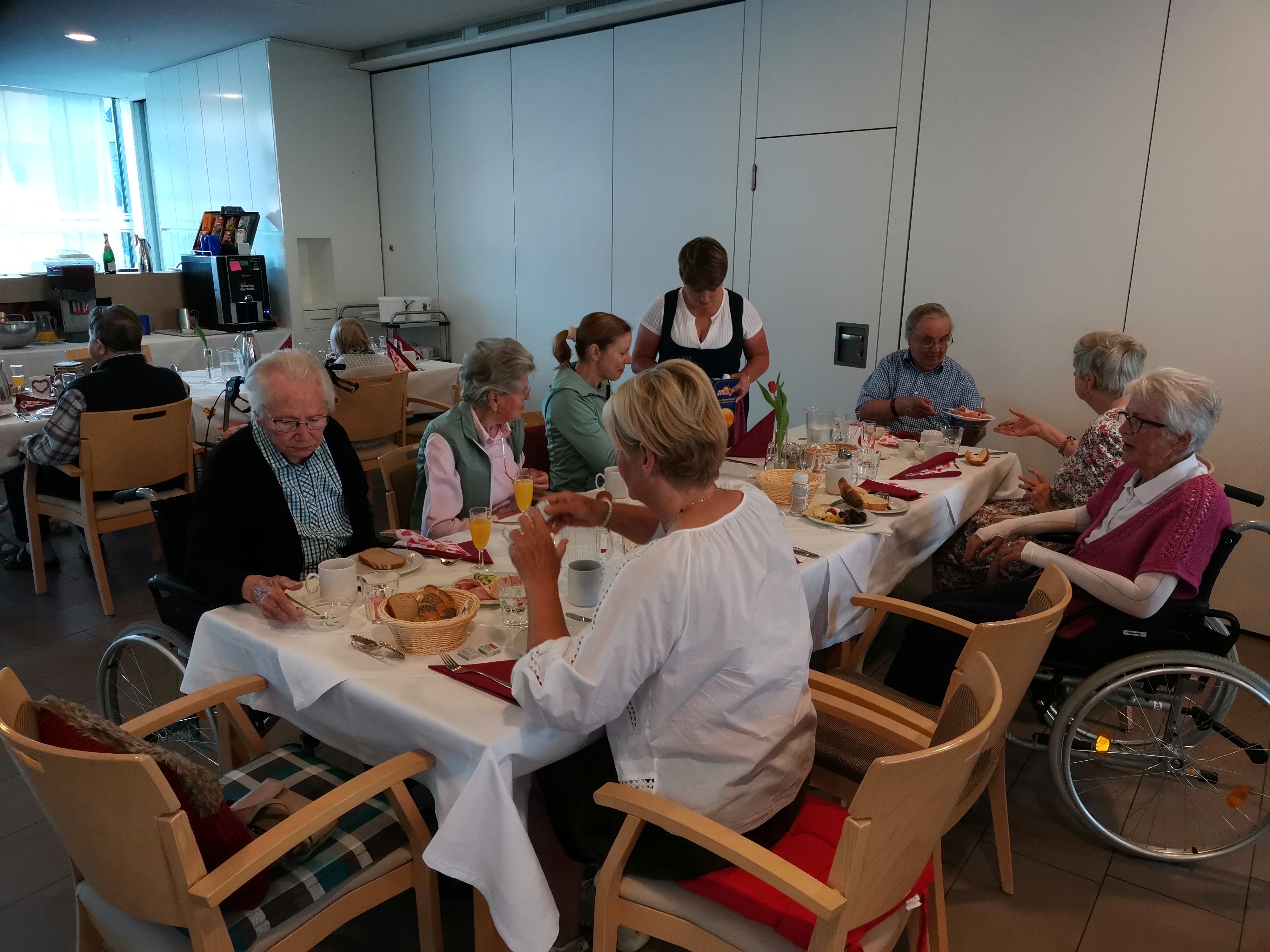 Die Bewohner:innen genießen das gemeinsame Muttertagsfrühstück.